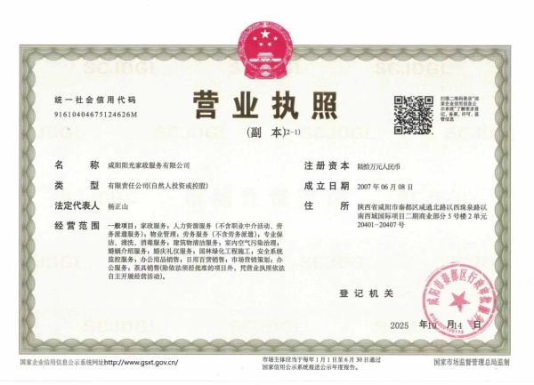 阳光家政2007年成立至今,已在咸阳扎根服务19年,以“做品牌,做口碑”的服务精神,以“阳光为人类美好生活而服务”的企业愿景,用专业、细致、温暖的服务标准,做好客户与求职者的桥梁和纽带作用,为您解困、为您分忧,同时,时刻牢记用心做事,用爱待人。